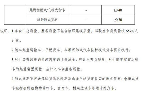 對(duì)載質(zhì)量系數(shù)的要求中包含很多專用車型,其中隨車起重運(yùn)輸車、平板貨車、車廂可卸式汽車按欄板式貨車要求執(zhí)行;對(duì)于裝有頂蓋的自卸汽車的頂蓋質(zhì)量,應(yīng)計(jì)入整備質(zhì)量,對(duì)于隨車起重運(yùn)輸車的起重裝置質(zhì)量,應(yīng)計(jì)入車輛整備質(zhì)量;廂式貨車不包含貨物運(yùn)輸車及由多用途貨車改裝的廂式貨車,倉柵式貨車包括倉柵結(jié)構(gòu)的養(yǎng)蜂車、畜禽車、桶裝垃圾車等運(yùn)輸類汽車。